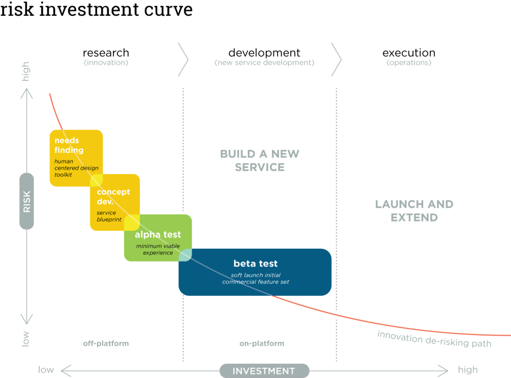 Peer Insight uses the risk-investment curve to visualize how we can de-risk opportunities quickly through in-market research. Affordable, off-platform testing provides strategic learning that informs concept development. Alpha tests sit at the end of the research phase where prototype fidelity and investment increases, but ventures are still off-platform and validated learning around the customer need and business model is the highest priority.''