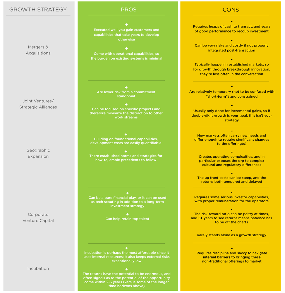 When it comes to investing in growth, or innovation, of either type, these are the specific corporate growth strategies that tend to get considered and implemented: