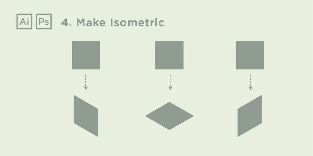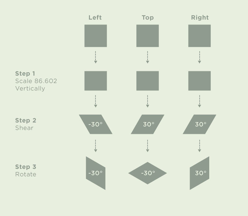 A technique that speeds up the process of making isometric art is to create flat designs and then scale, shear and rotate it in specific ways to make it fit on an isometric grid. Those exact parameters are listed in this table below: