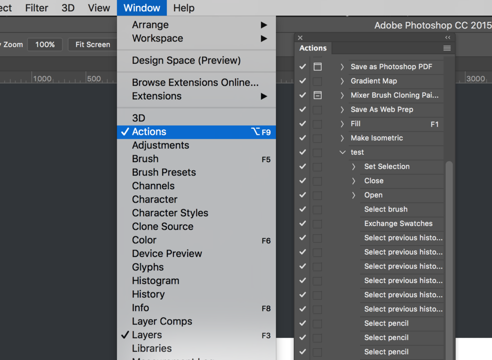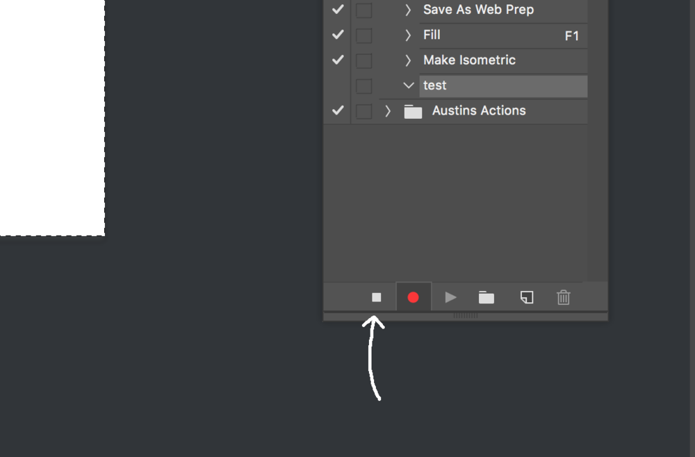 Since making the flat art into pieces that would fit into an isometric grid involves multiple, identical steps and you would have to repeat it many times to create isometric art, you might as well make actions to do the job for you. For my workflow, I record three separate actions for the left, top, and right perspectives.