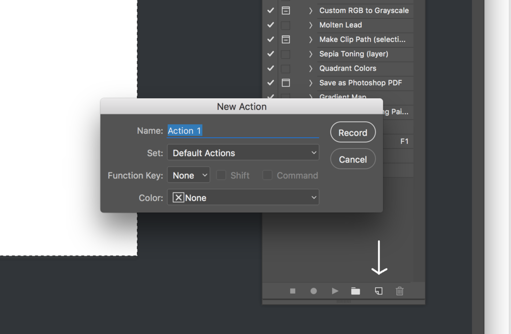 Click on the Create New Action button (looks just like the New Layer button from the Layers panel). Decide on what to name your action and assign a function key (e.i. F1-12) if you'd like to use it with a keyboard shortcut. When you're done, hit Record.