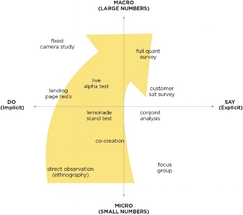 The arrow shows the entrepreneur’s preferred path from hunch to launch. Experienced entrepreneurs have a strong bias to stay in the domain of what users Do, rather than Say.